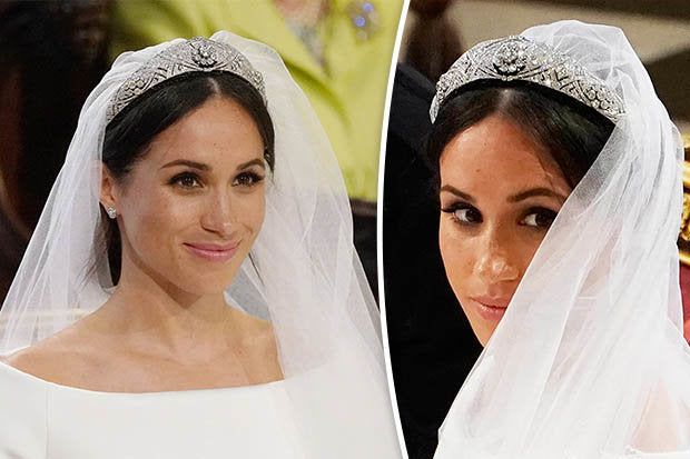 Perhaps because the tiara was the focal point, Meghan chose not to wear a necklace, which seemed just right. Her Givenchy bridal gown was simple, and the tiara was, well, a crowning touch. She also went small on her diamond earrings, which were from Cartier, and added a Cartier diamond bracelet.